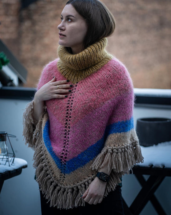 The Pink Hour - er en strikkeoppskrift på en kort luksus poncho i farger som hentet ut ifra den magiske rosa timen. Ponchoen er designet for å kunne brukes både ute og inne, og strikkes i en kombinasjon av gull, alpakka og mohair.