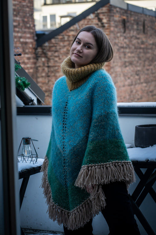 som føles behagelig også mot bar hud. Ponchoen er strikket i en