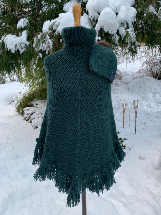 en ensfarget poncho i mørk grønn deilig og myk mix av merino og baby alpakka,