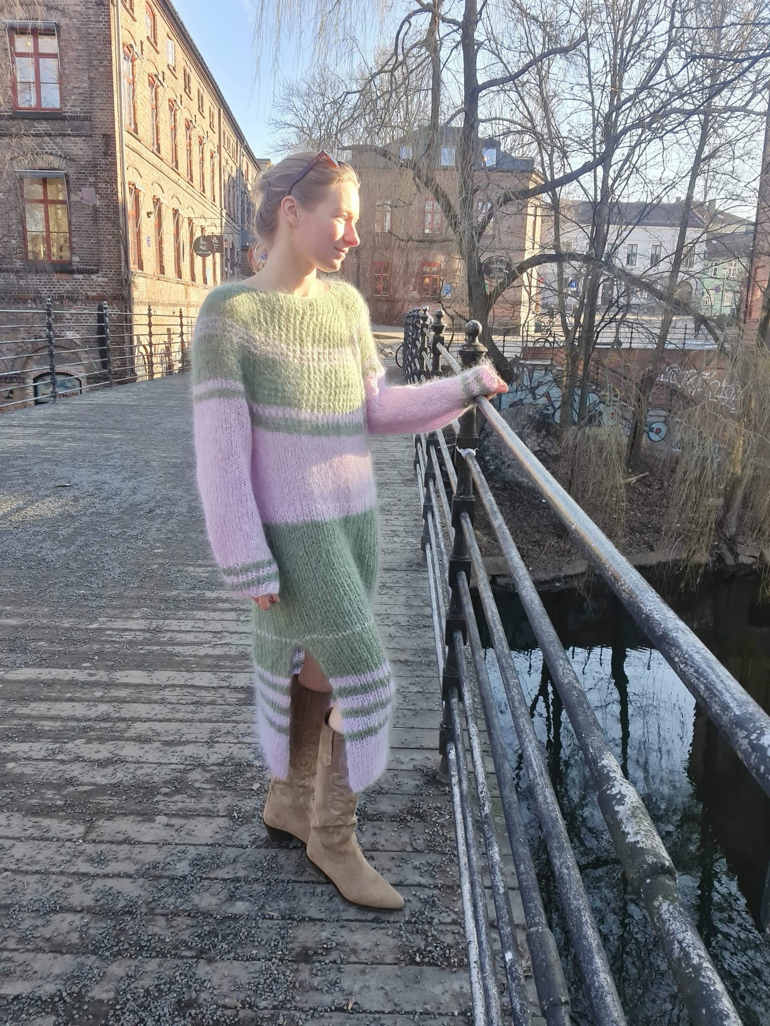 My CosyWinterdress - is a lovely light purple and jade green, broad-striped cozy and loose dress in soft mohair with a super-feminine hole pattern in the upper part of the dress.