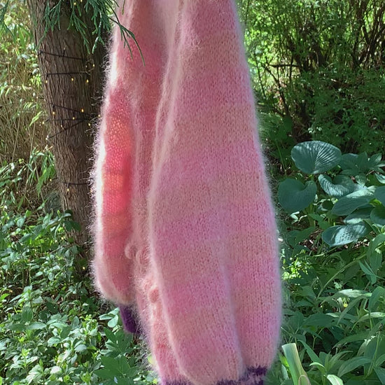 The CosyMonday Jacket- is a soft cardigan, knitted in lovely pink striped mohair with gold details, and with a purple wool welt. The knitted jacket has popcorn at the bottom of the jacket, and wide puff sleeves.