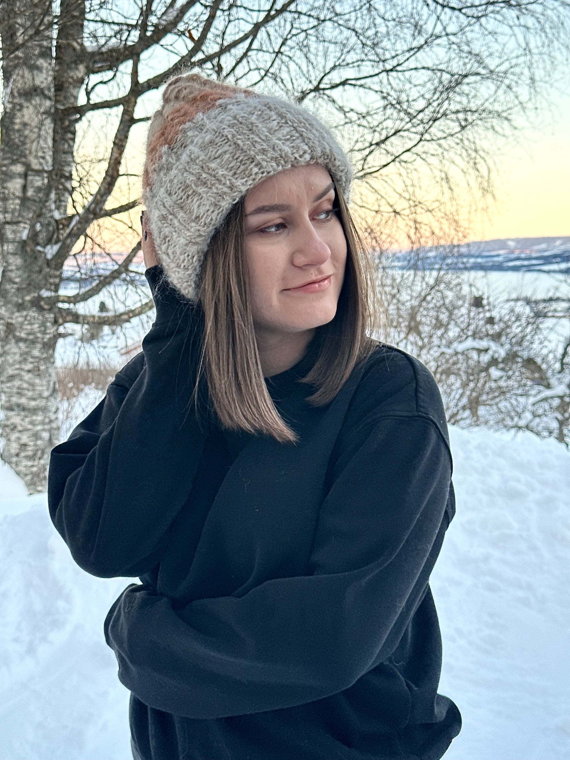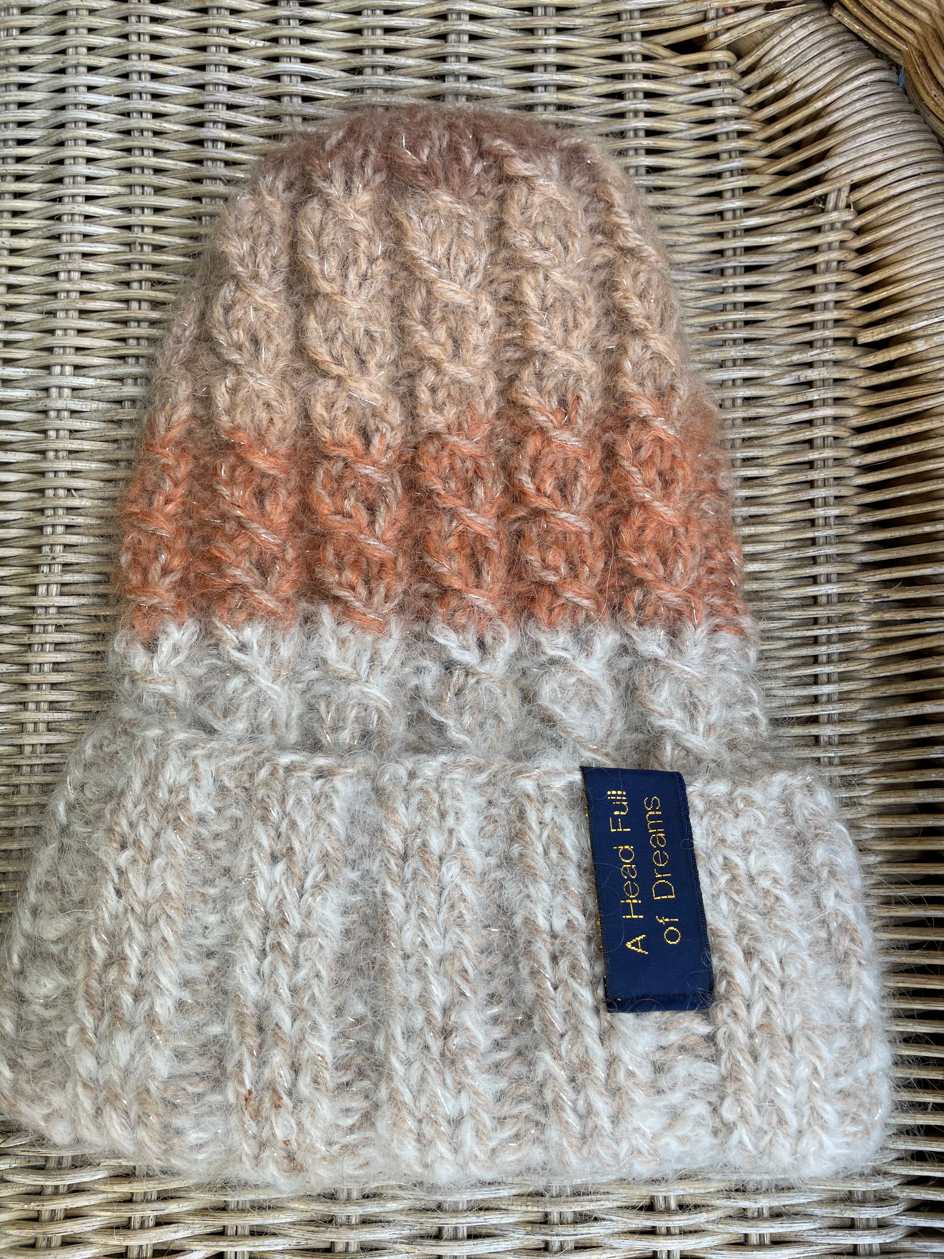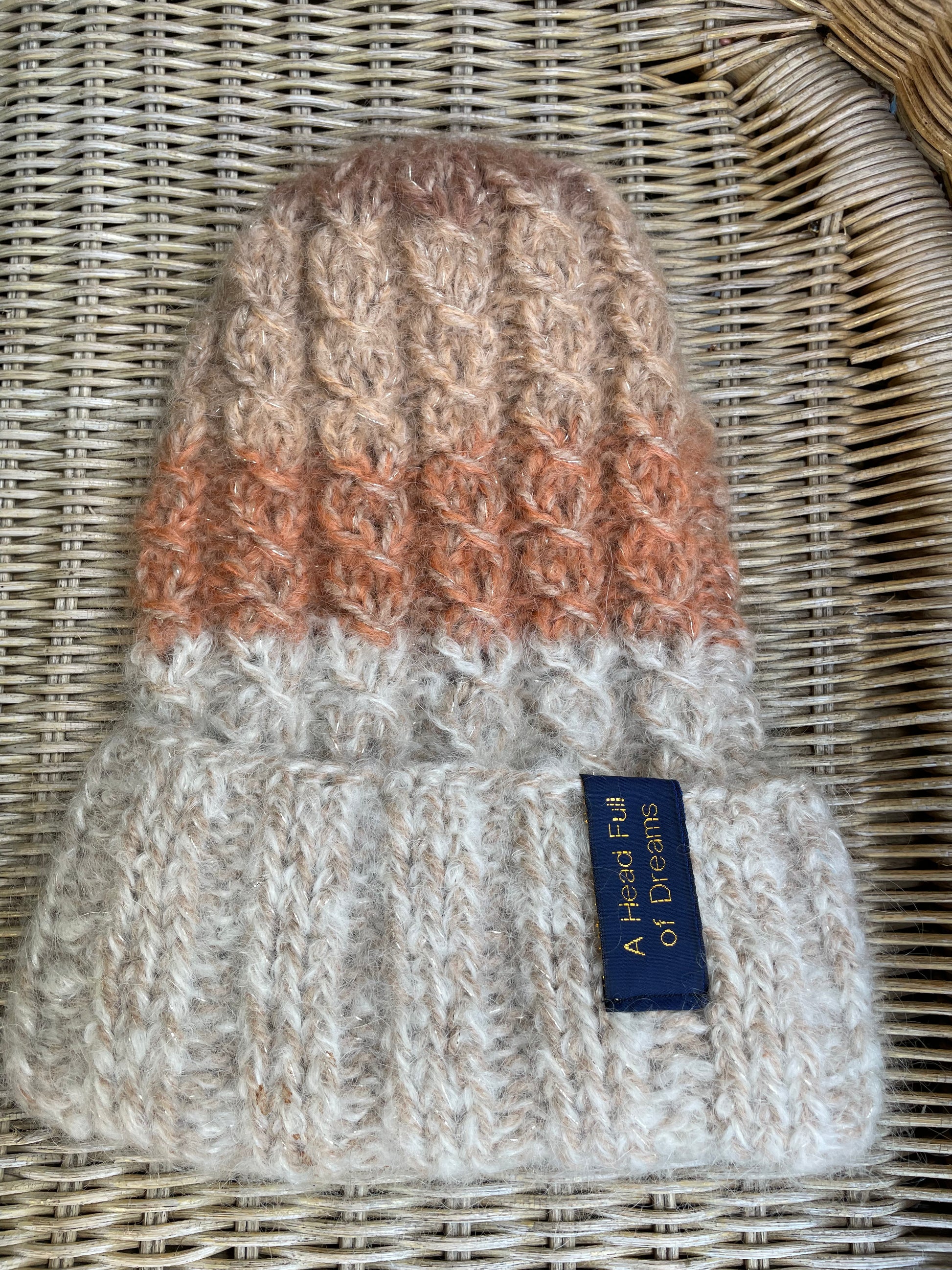 Woody - fra A HEAD FULL OF DREAMS COLLECTIONS, er en beanie strikket i dobbelt mohair, beige toner og gull , i farger inspirert av gammel ved.