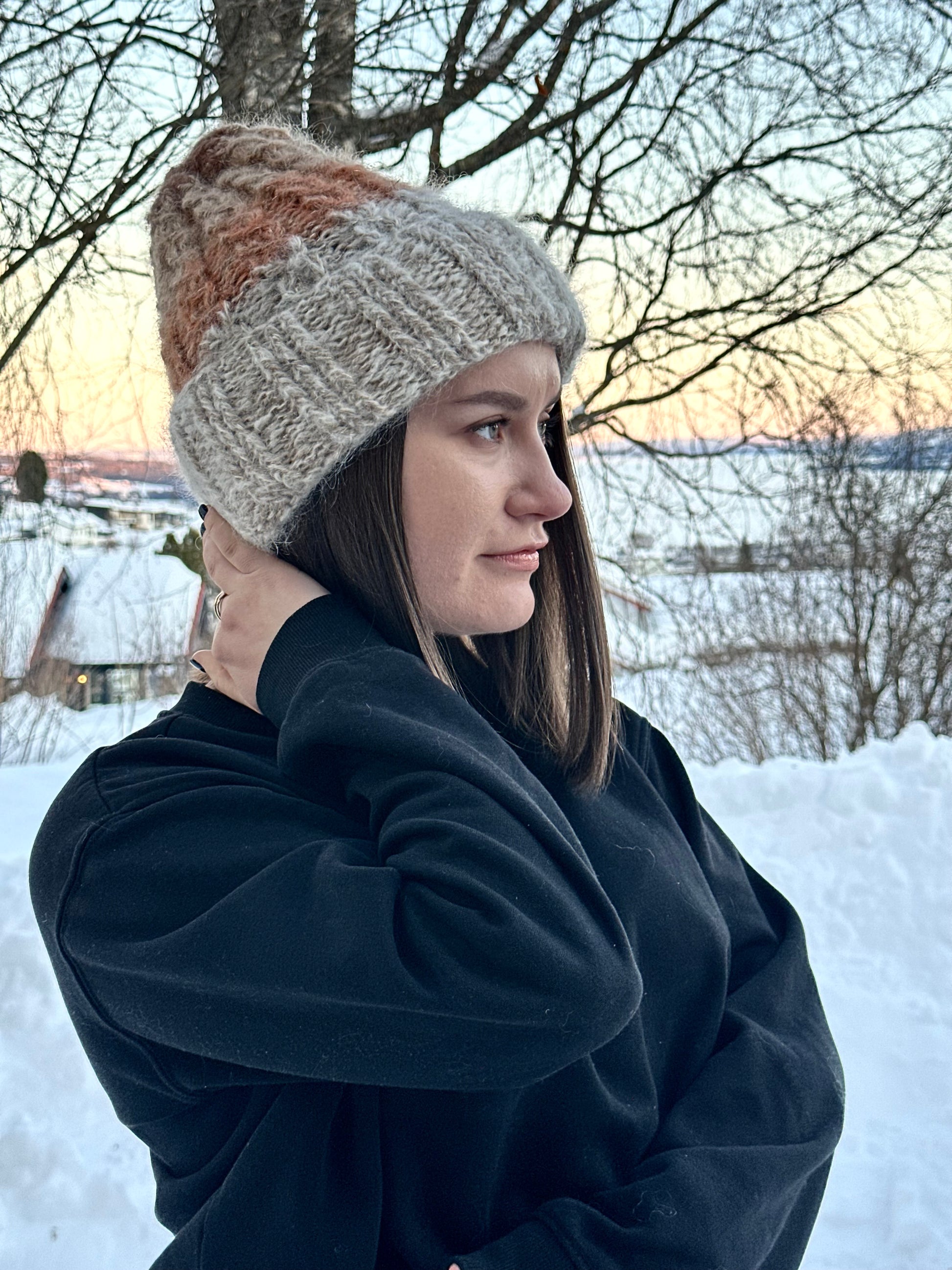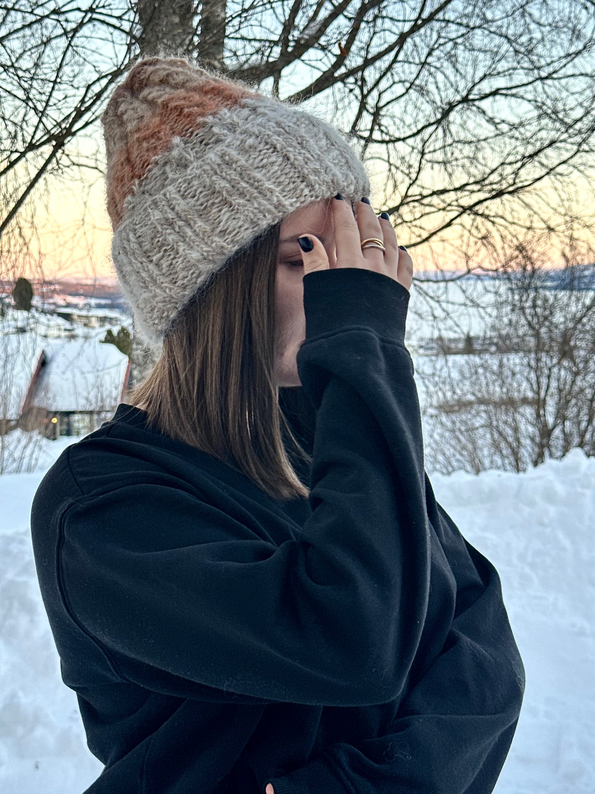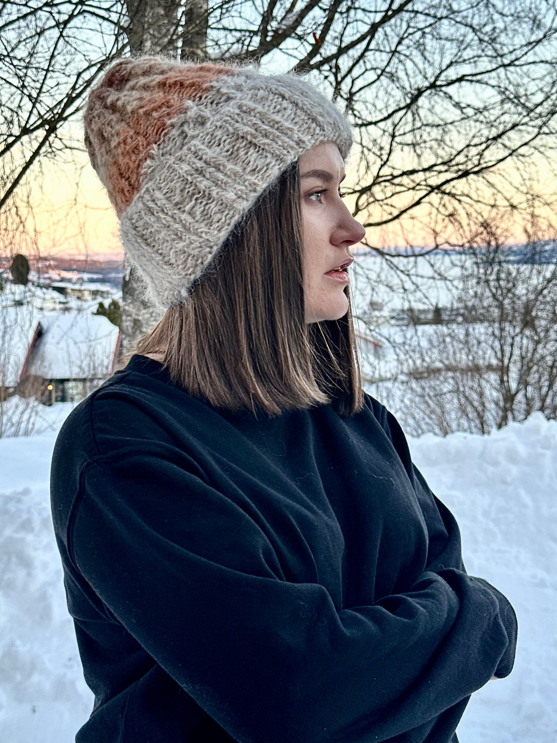 Woody - fra A HEAD FULL OF DREAMS COLLECTIONS, er en beanie strikket i dobbelt mohair, beige toner og gull , i farger inspirert av gammel ved.