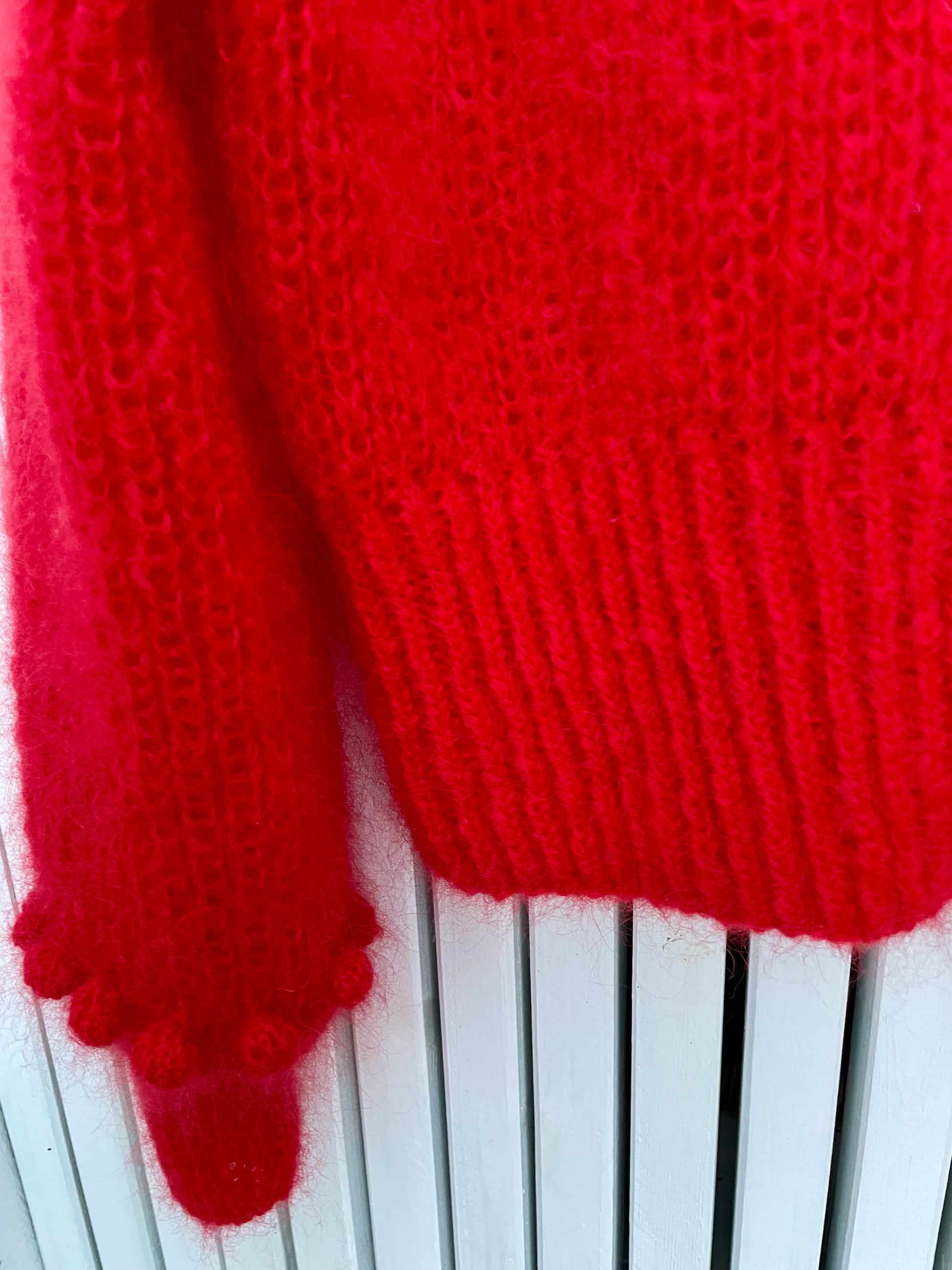 Christmas Please - er en strikkeoppskrift på en superklassisk og feminin halvpatent julegenser, med høyt liv og lange mansjetter. Genseren er designet med popkorn på erme og i to variasjoner: smal og vid båthals.