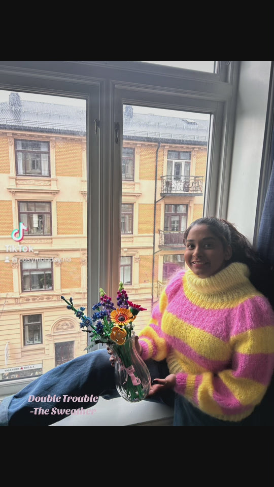 Double Trouble - er en strikkeoppskrift på en livkort puffgenser, designet med i - cord kant og vrangbord, og med ekstra vidde i pufferme. Genseren har høy hals, og fløyelsbånd som dekorativ og feminin snøring i livet. Denne kan tas av og på etter behov og ønske .