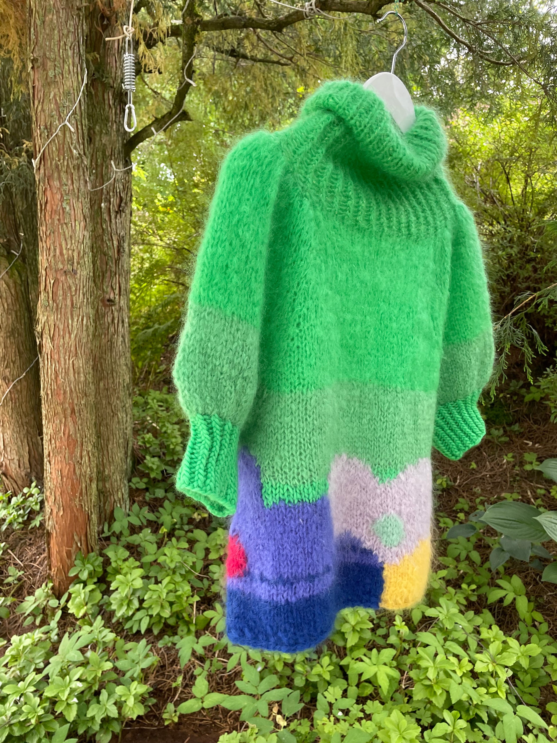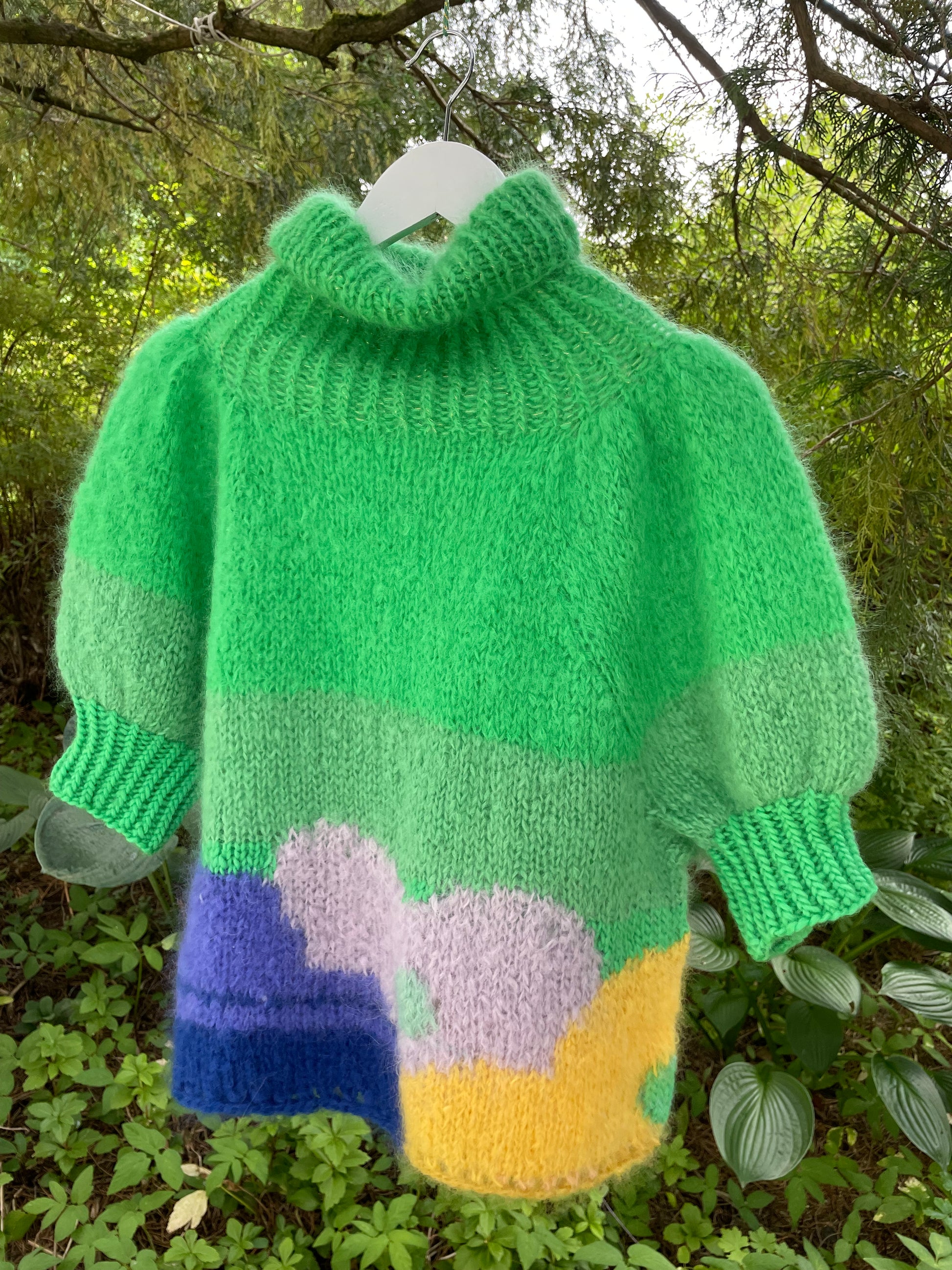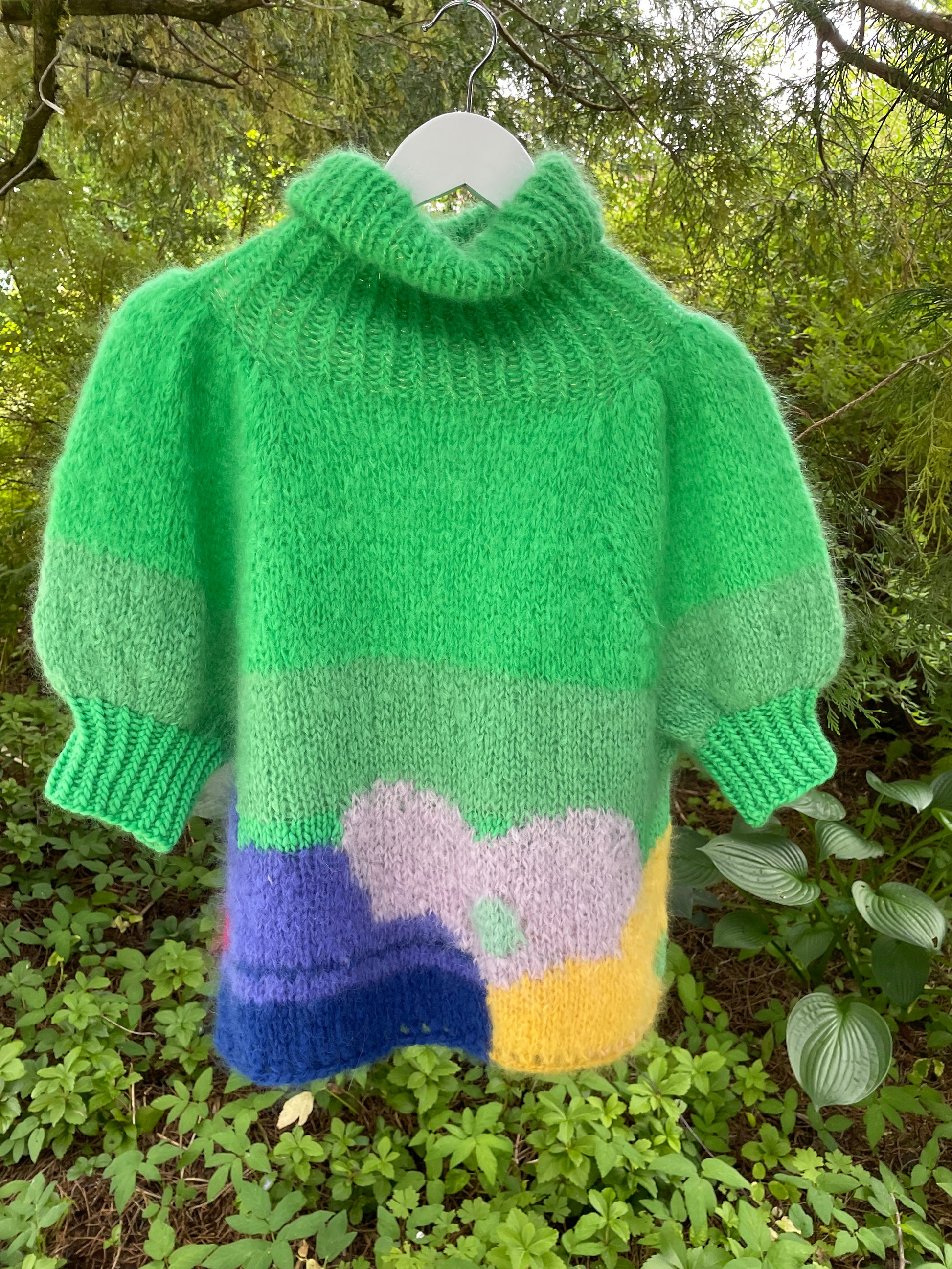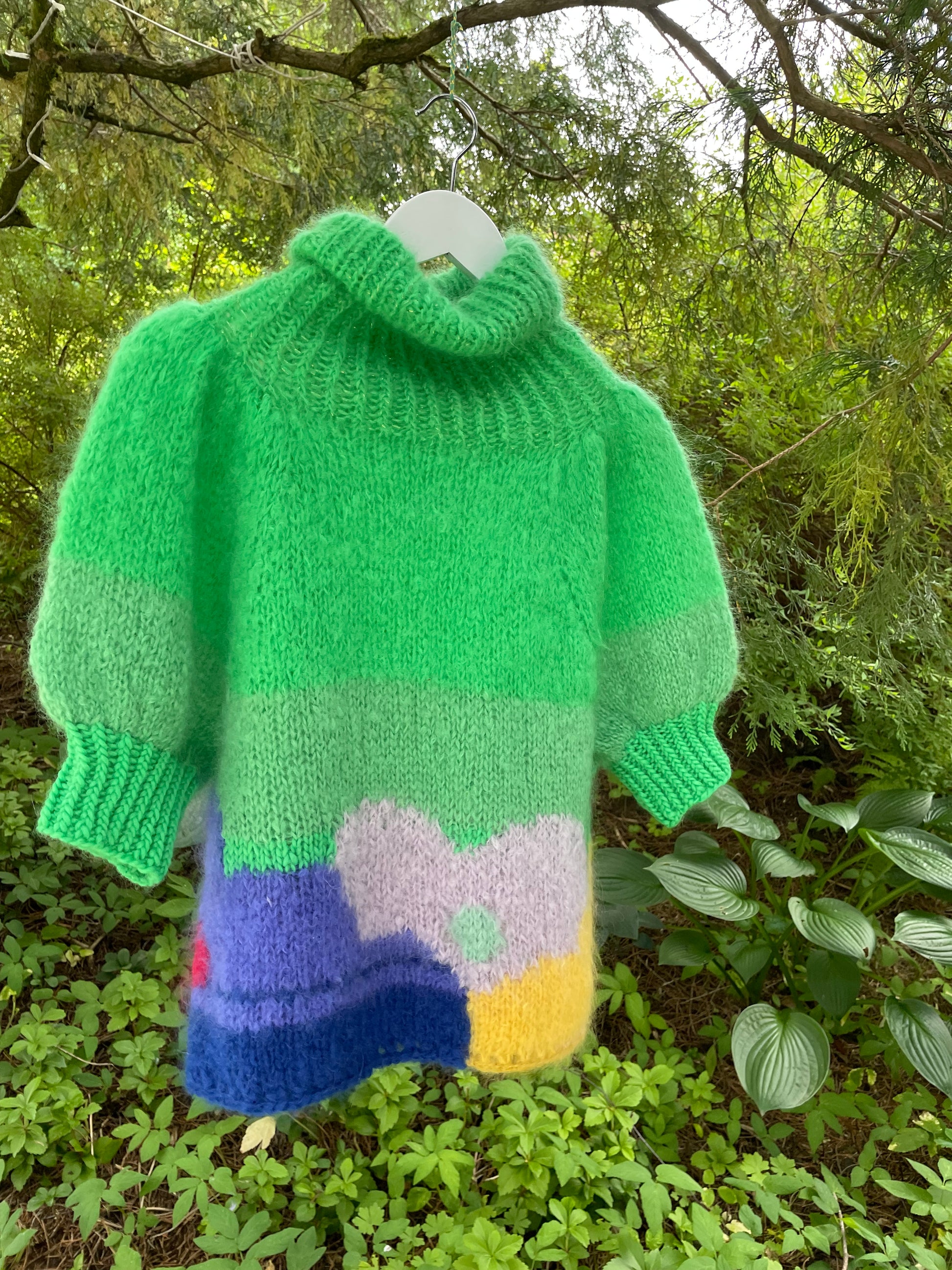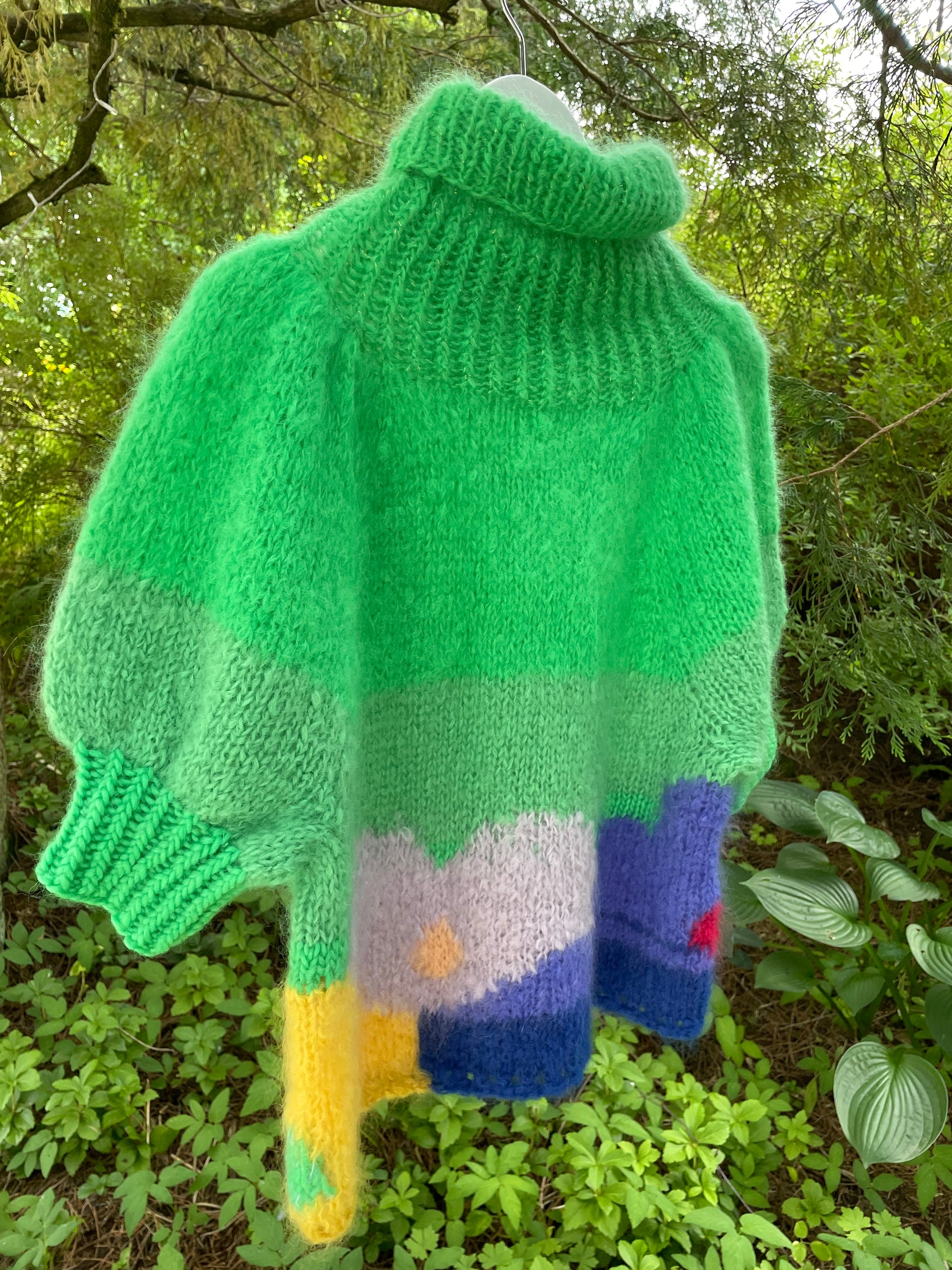 Flower Power - er en superfeminin bohemsk inspirerte genser i grønt med bohemske blomster i lilla, blått og gult. Genseren er strikket i mohair og ull. Genseren har høy hals og korte puffermer med gull detaljer.