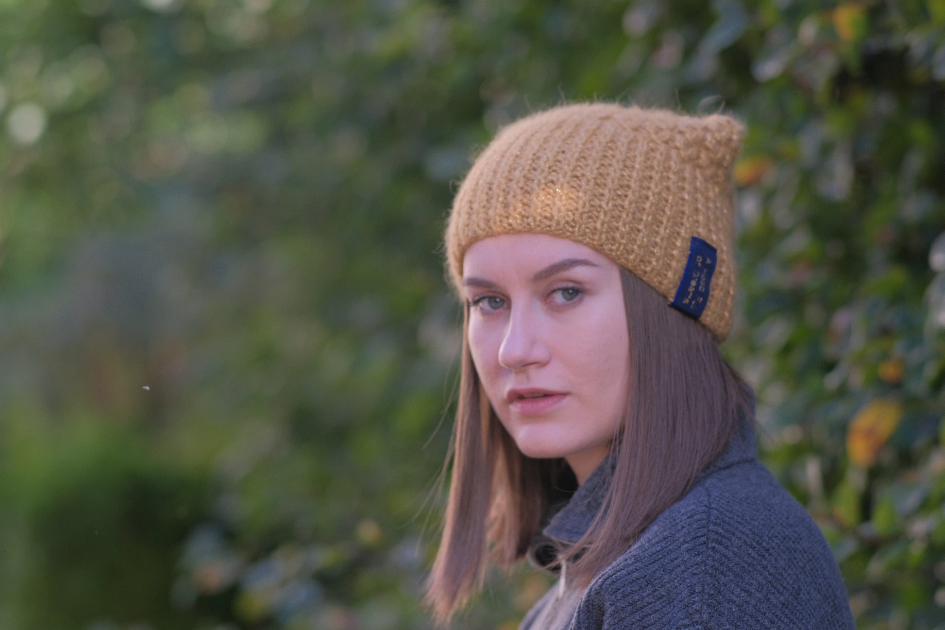 Golden Sky - er et beanie skjerf designet i flettestrikk, og gulltråd. Skjerfet har dekorativ vintage knapp i strass. Skjerfet er designet for å både kunne kneppes bak, under haken, og bæres uknappet bak.