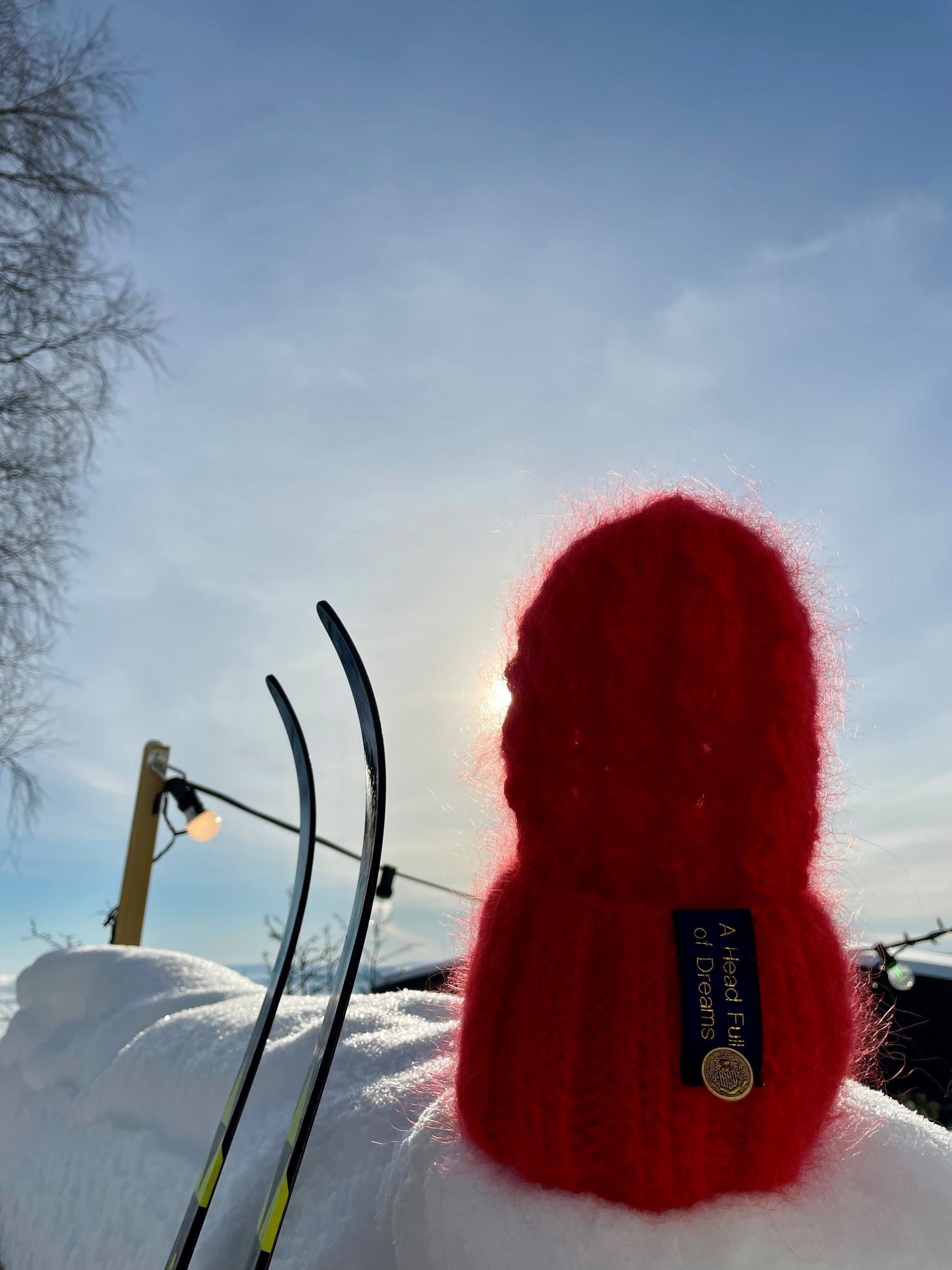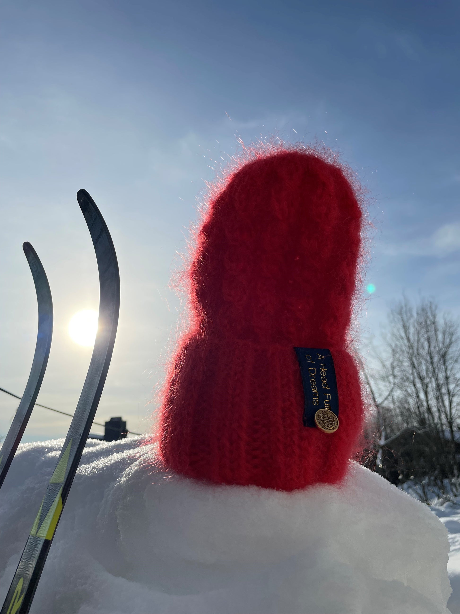 RED - er en strikkeoppskrift på en bohemsk, samtidig klassisk inspirert lue, strikket i klar rød mohair, med falske fletter og høy vrangbord.