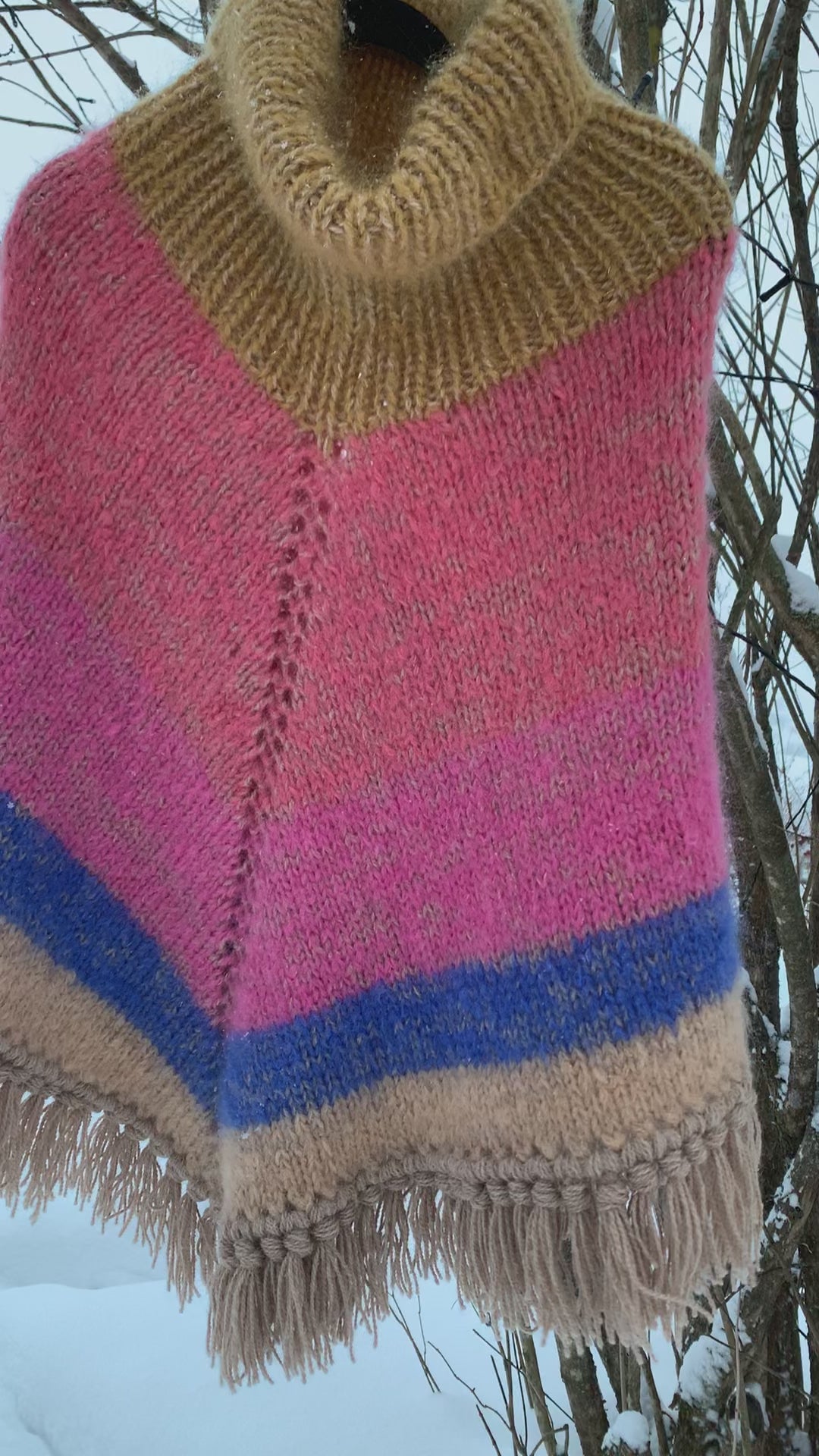 The Pink Hour - er en strikkeoppskrift på en kort og melert luksusponcho i alpakka, gull og mohair, med farger inspirert av den magiske rosa timen. Designet er en del av Paradise-serien og kombinerer lette garn med et mykt og elegant uttrykk.