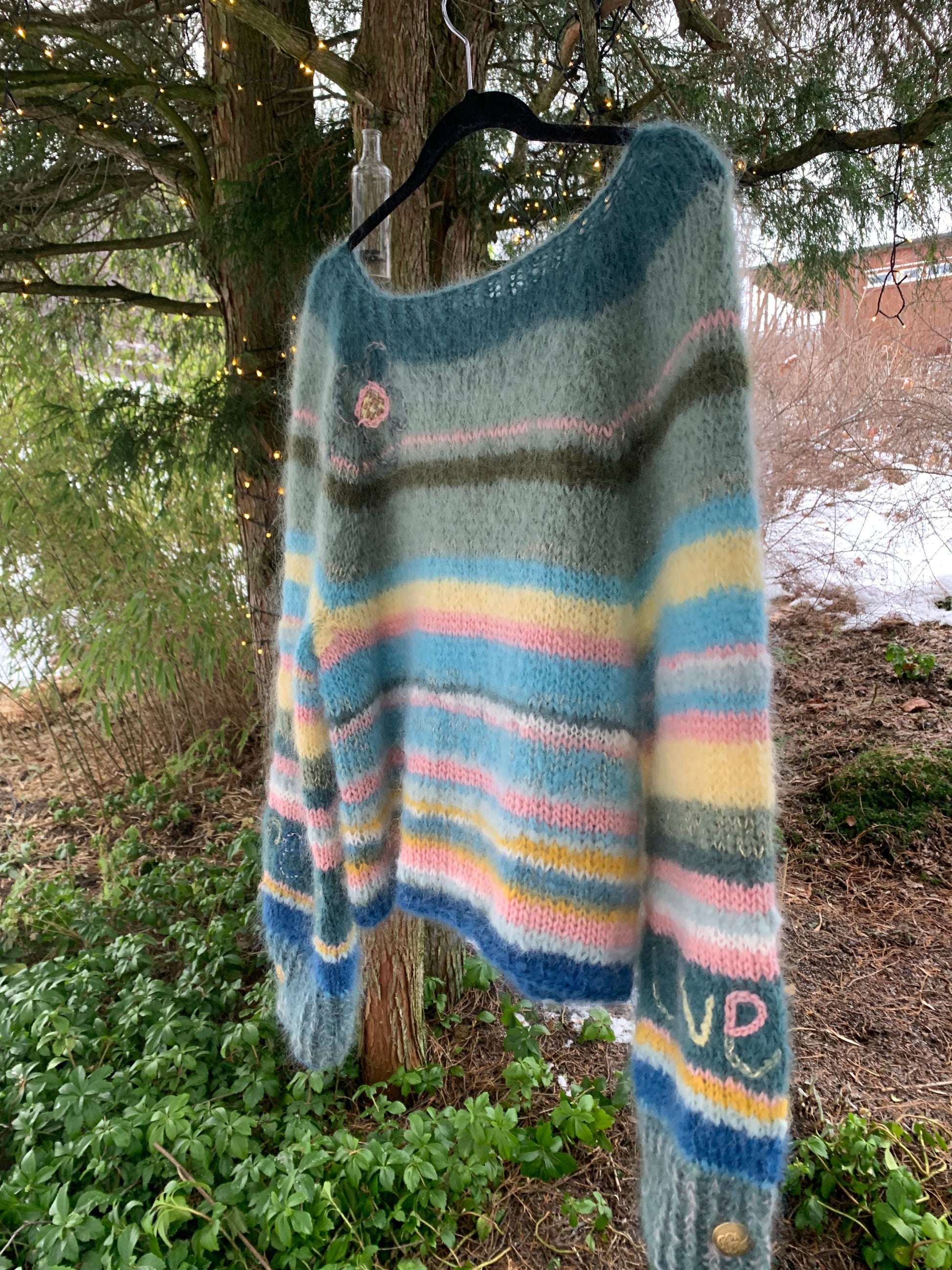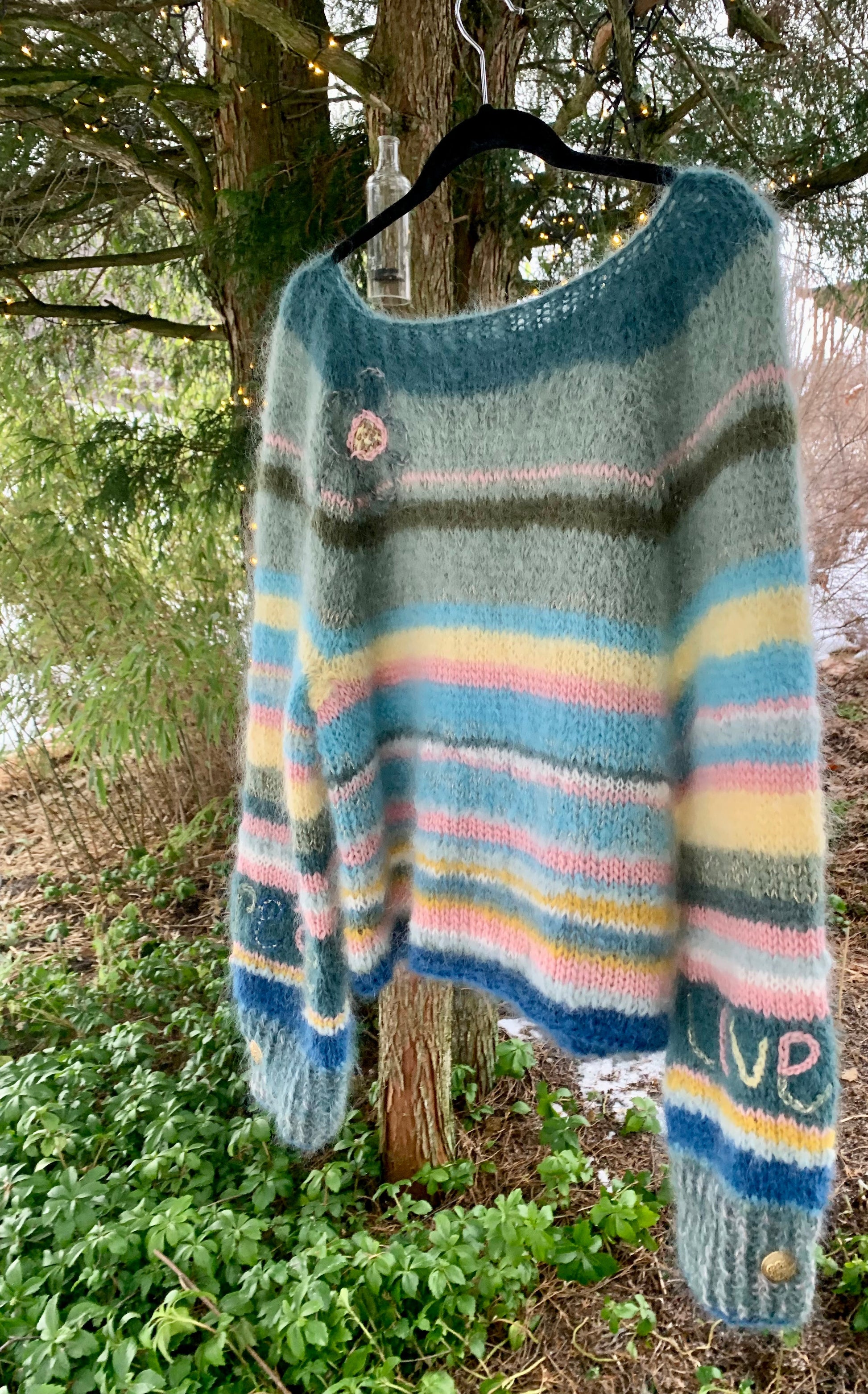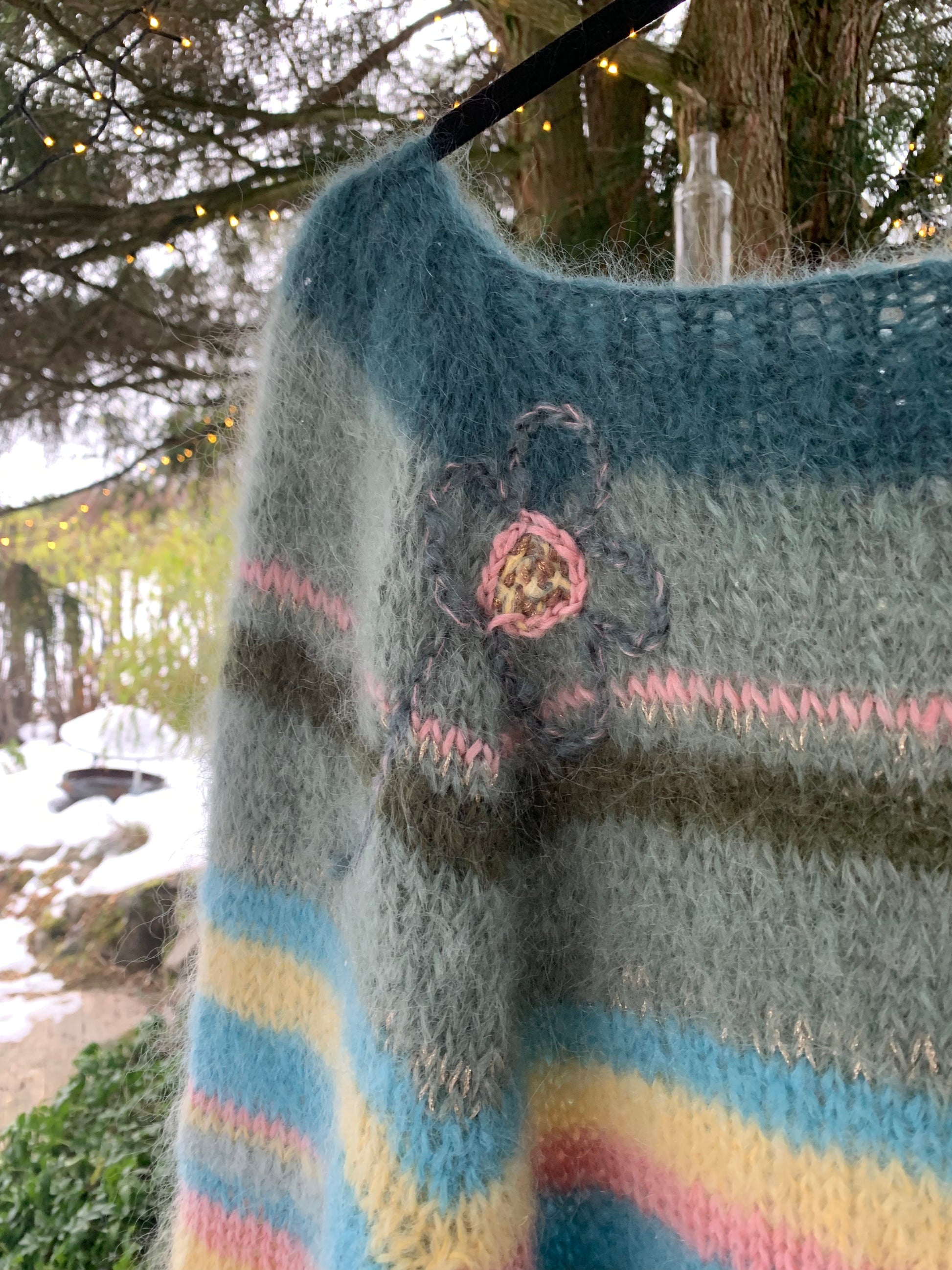 En smalstripet mohairgenser med rette ermer, rene linjer og innslag av gull. Designet har tekstbroderi på ermene og blomsterbroderi på bolen, som gir plagget et personlig og håndlaget uttrykk.
