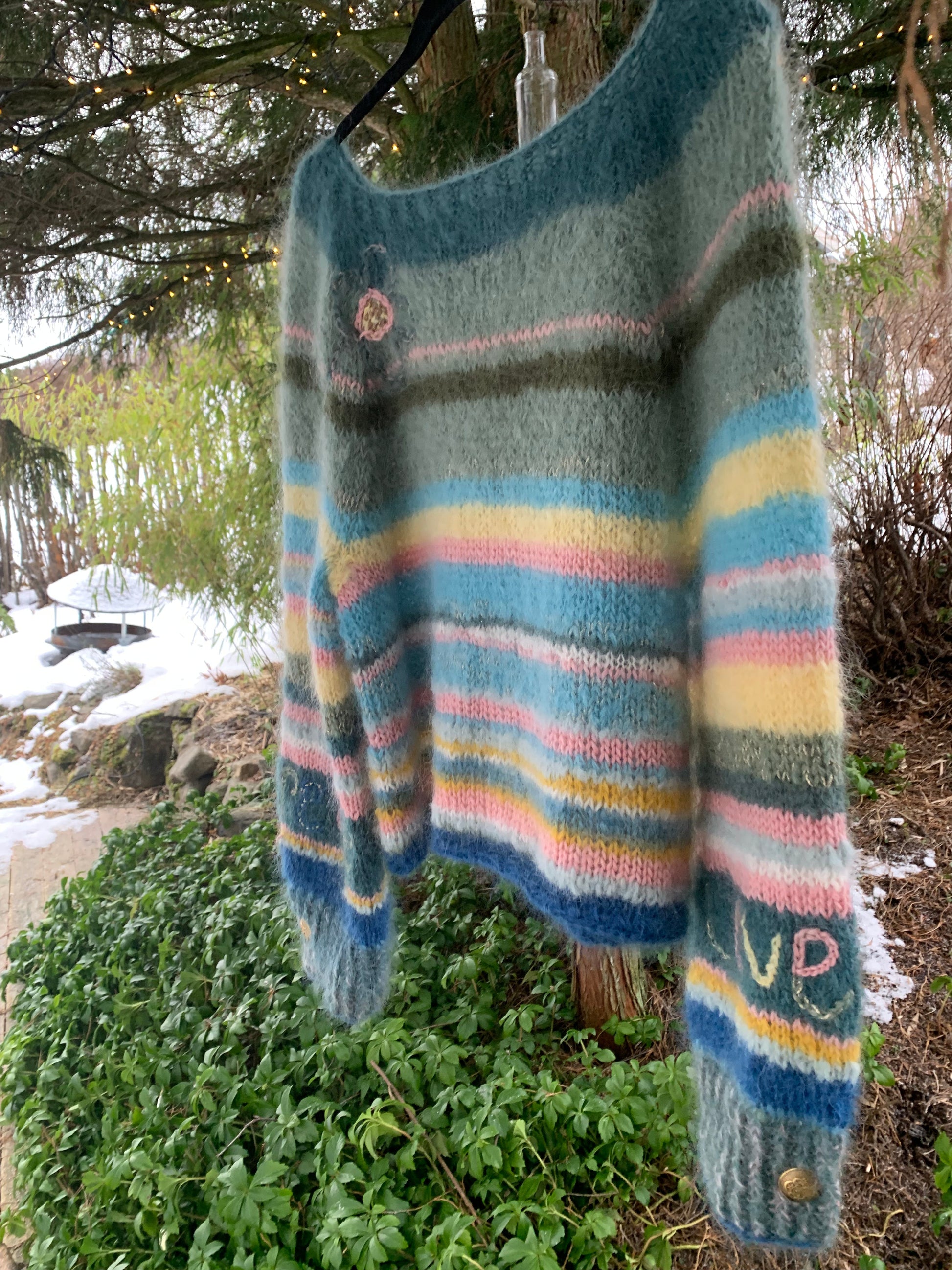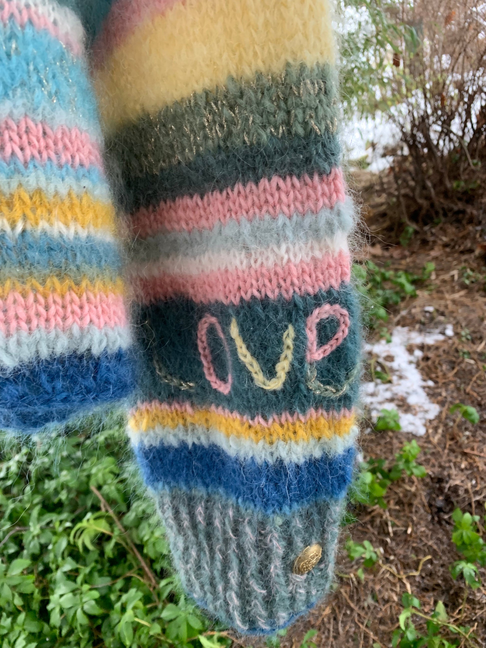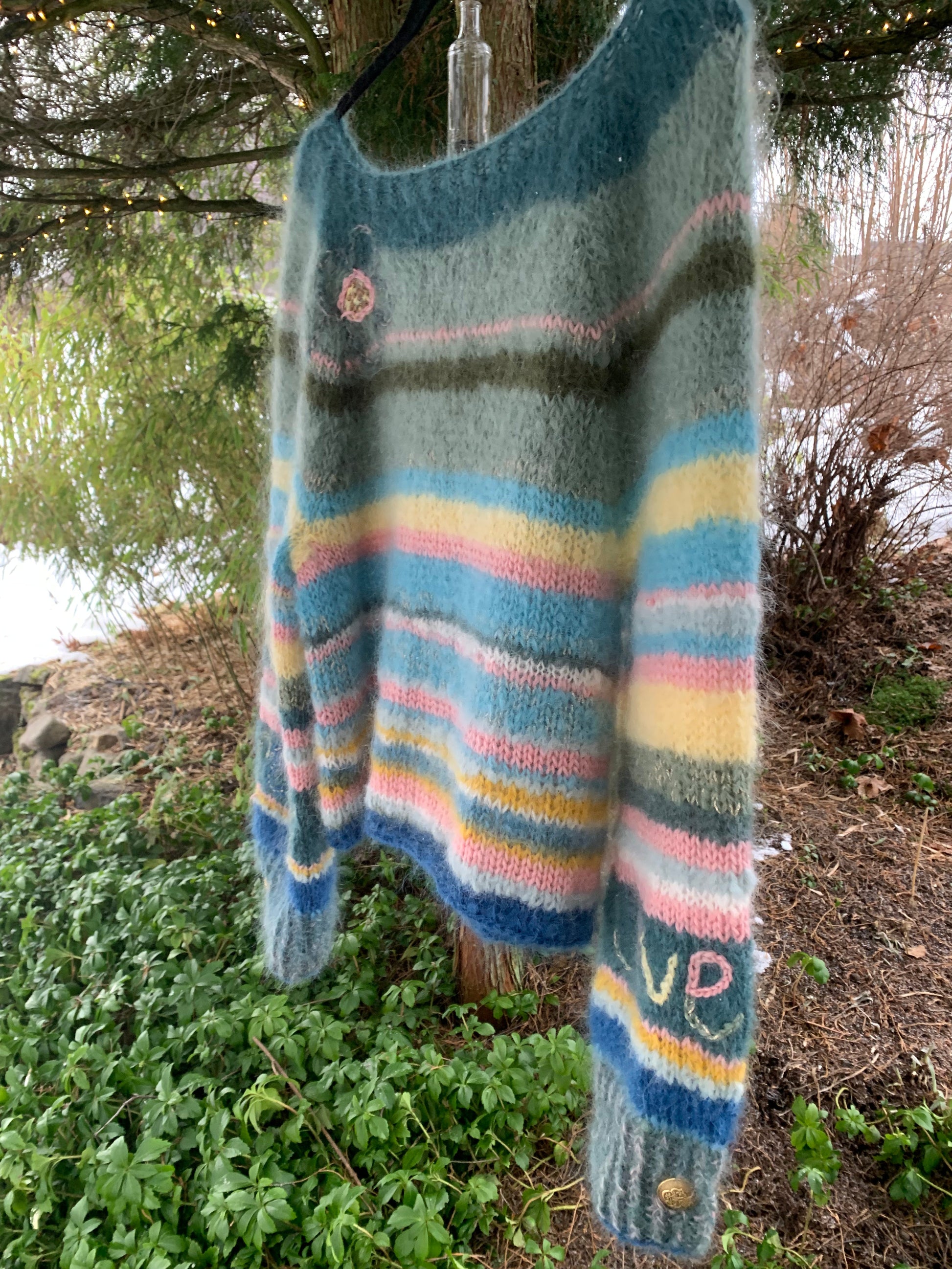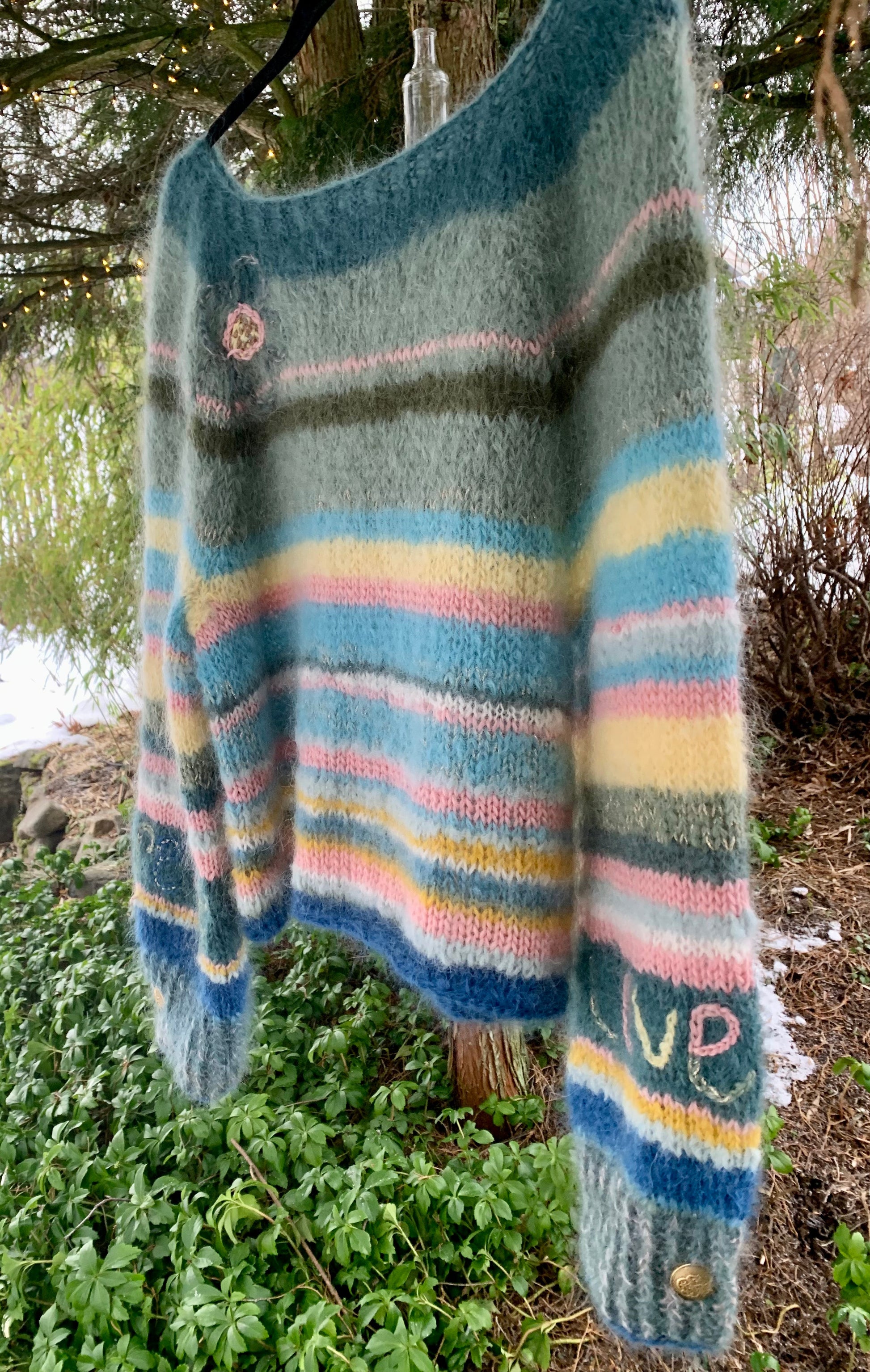 En smalstripet mohairgenser med rette ermer, rene linjer og innslag av gull. Designet har tekstbroderi på ermene og blomsterbroderi på bolen, som gir plagget et personlig og håndlaget uttrykk.